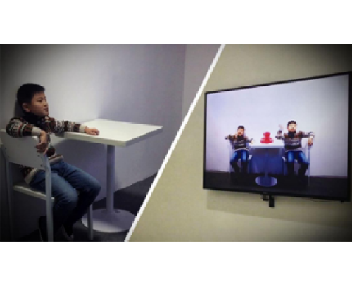 小朋友们都爱照镜子,喜欢跟镜子里的自己互动。当小朋友举起左手时,镜子里的自己同时举起了右手。小 朋友们玩的不亦乐乎。而当小朋友们坐在我们大屏幕前的椅子上时,会看到大屏幕中的自己,像双胞胎一样 在模仿着自己,而动作却比自己慢半拍。